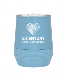 12 oz double wall 18/8 stainless steel thermal tumbler with copper vacuum insulation, push-on lid, matching swivel closure, and removable silicone base.