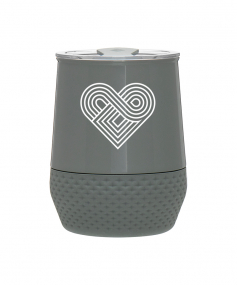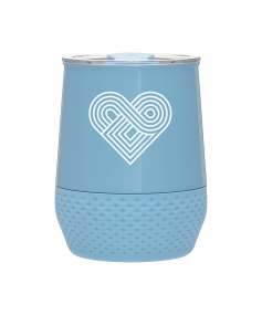 12 oz double wall 18/8 stainless steel thermal tumbler with copper vacuum insulation, push-on lid, matching swivel closure, and removable silicone base.