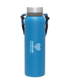 32 oz double wall 18/8 stainless steel thermal bottle with copper vacuum insulation, insulated stainless steel threaded lid, silicone ring, removable strap with buckles, removable clasps, and powder coated finish. Individual gift box. Hand wash recommended. Do not microwave. Complies with FDA, Prop 65. 11" H x 3.1875" W