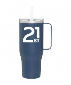 40 oz double wall 18/8 stainless steel thermal mug with copper vacuum insulation, stainless steel rim, dual-purpose push-on clear lid, matching sliding closure, flexible wide silicone straw, and powder coated finish. Individual gift box. Hand wash recommended. Do not microwave. Complies with FDA, Prop 65. 9.75" H x 4" W